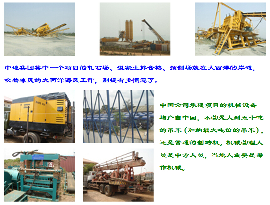 中地集團(tuán)其中一個(gè)項(xiàng)目的軋石場(chǎng)、混凝土拌合樓、預(yù)制場(chǎng)就在大西洋的岸邊,吹著涼爽的大西洋海風(fēng)工作,別提有多愜意了。中國(guó)公司承建項(xiàng)目的機(jī)械設(shè)備均產(chǎn)自中國(guó),不管是大到五十噸的吊車(加納最大噸位的吊車),還是普通的制磚機(jī)。機(jī)械管理人員是中方人員,當(dāng)?shù)厝酥饕遣僮鳈C(jī)械。