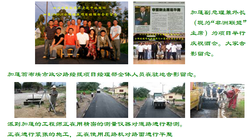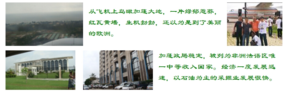 從飛機(jī)上鳥瞰加蓬大地,一片綠郁蔥莽,紅瓦黃墻,生機(jī)勃勃,還以為是到了美麗的歐洲。加蓬政局穩(wěn)定,被列為非洲法語區(qū)唯一中等收入國(guó)家。經(jīng)濟(jì)一度發(fā)展迅速,以石油為主的采掘業(yè)發(fā)展很快。加蓬年平均氣溫26℃,擁有豐富的森林資源,森林面積占全國(guó)土地面積的85%,被譽(yù)為非洲的“綠金之國(guó)”。加蓬的氣候很適宜植物的生長(zhǎng),美麗的出產(chǎn)的蔬菜瓜果品種繁多,真稱得上花朵,絢麗而多姿。加蓬副總理兼外長(zhǎng)(現(xiàn)為“非洲聯(lián)盟”主席)為項(xiàng)目舉行慶祝酒會(huì)。大家合影留念。加蓬翁布埃市政公路經(jīng)援項(xiàng)目經(jīng)理部全體人員在駐地合影留念。派到加蓬的工程師正在用精密的測(cè)量?jī)x器對(duì)道路進(jìn)行勘測(cè)。正在進(jìn)行緊張的施工,正在使用壓路機(jī)對(duì)路面進(jìn)行平整站在自己修建的馬路上,別有一翻滋味在海邊一處施工工地現(xiàn)場(chǎng)。