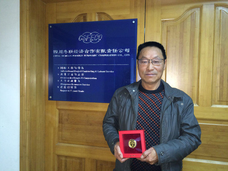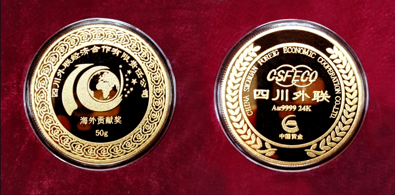 2016年猴年新春伊始,四川外聯(lián)經(jīng)濟(jì)合作有限責(zé)任公司對首位陪伴公司十年海外發(fā)展的員工黃成良先生給予獎勵,授予他一枚“十年海外貢獻(xiàn)獎”50克純金金幣獎?wù)拢?/p>